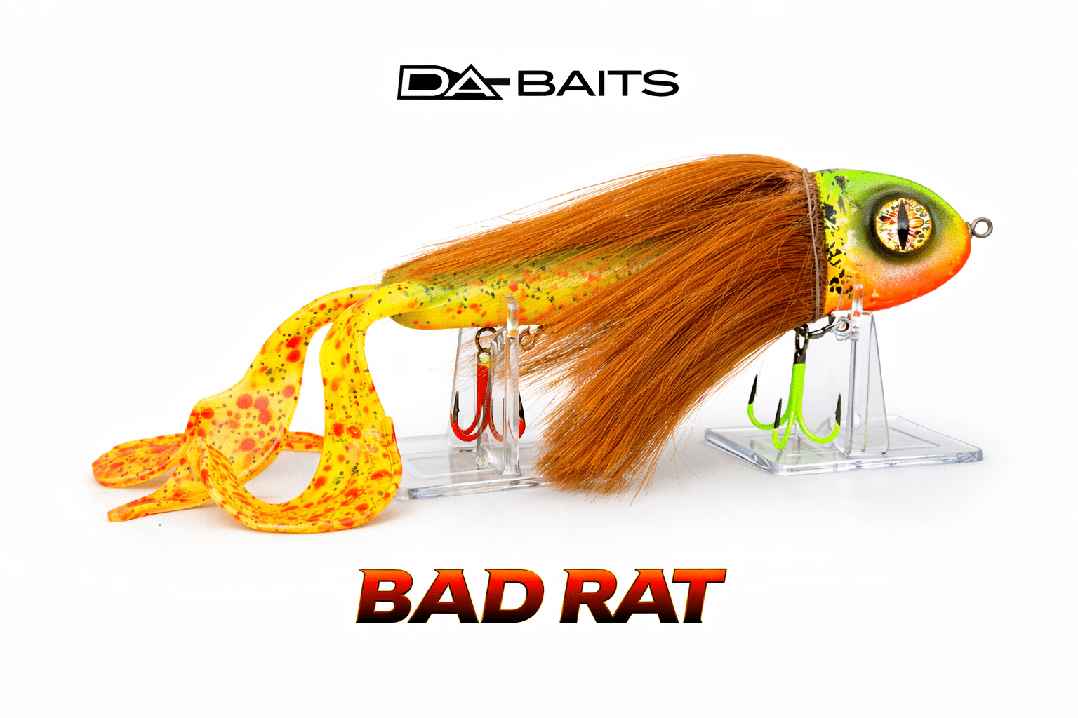 De Bad Rat is een opvallende, handgemaakte creatie met karakter. Een verzwaarde houten kop, met zorg afgewerkt met airbrush-details, gecombineerd met haar en een soepel softbait-lichaam. Deze unieke mix van materialen zorgt voor een verleidelijk, natuurlijk spel onder water waar roofvis simpelweg niet omheen kan.